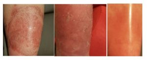 Customer with serious psoriasis and inflammation. After treatments, customer was seen with amazing improvement. Customer was treated with Bio-resonance Therapy where the underlying root cause is found and treated together with Bioptron Light Therapy that healed the surface of the infected area.